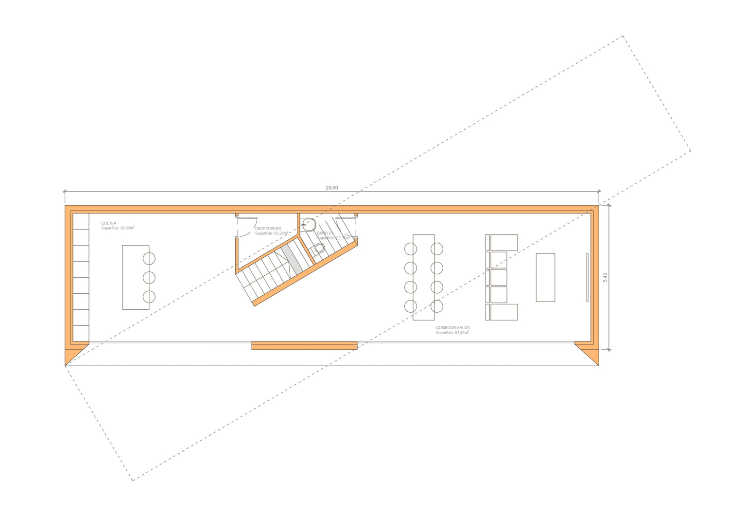 En la planta baja se sitúa la zona de día con tres ambientes diferenciados pero conectados entre sí: salón, comedor y cocina.