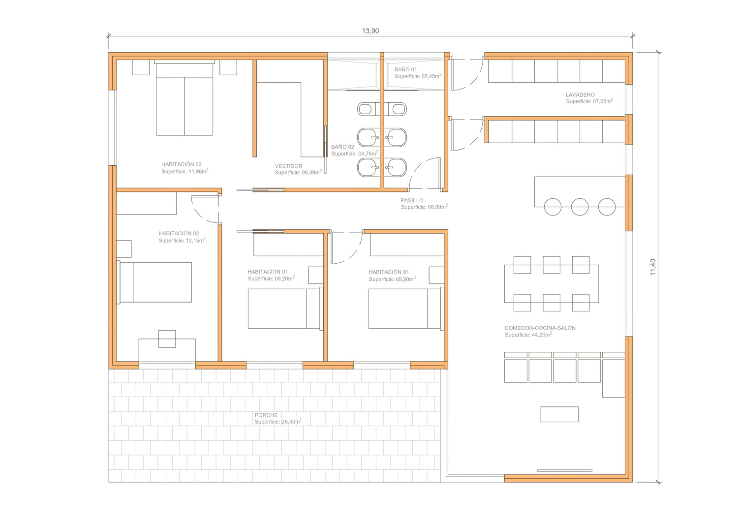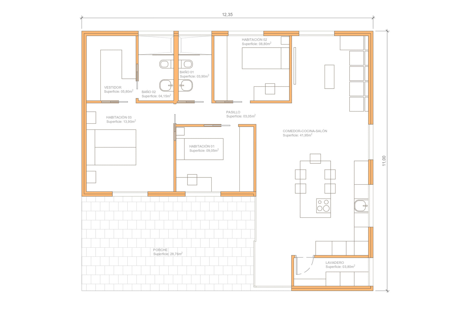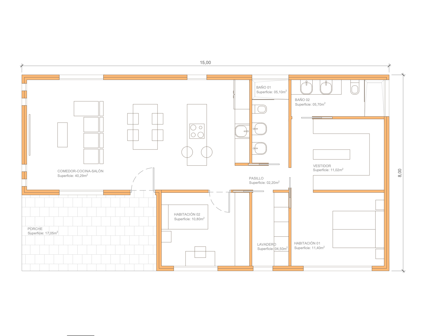 - Cocina: mobiliario e isla (personalizable), campana, vitrocerámica, fregadero y calentador de 100 litros.