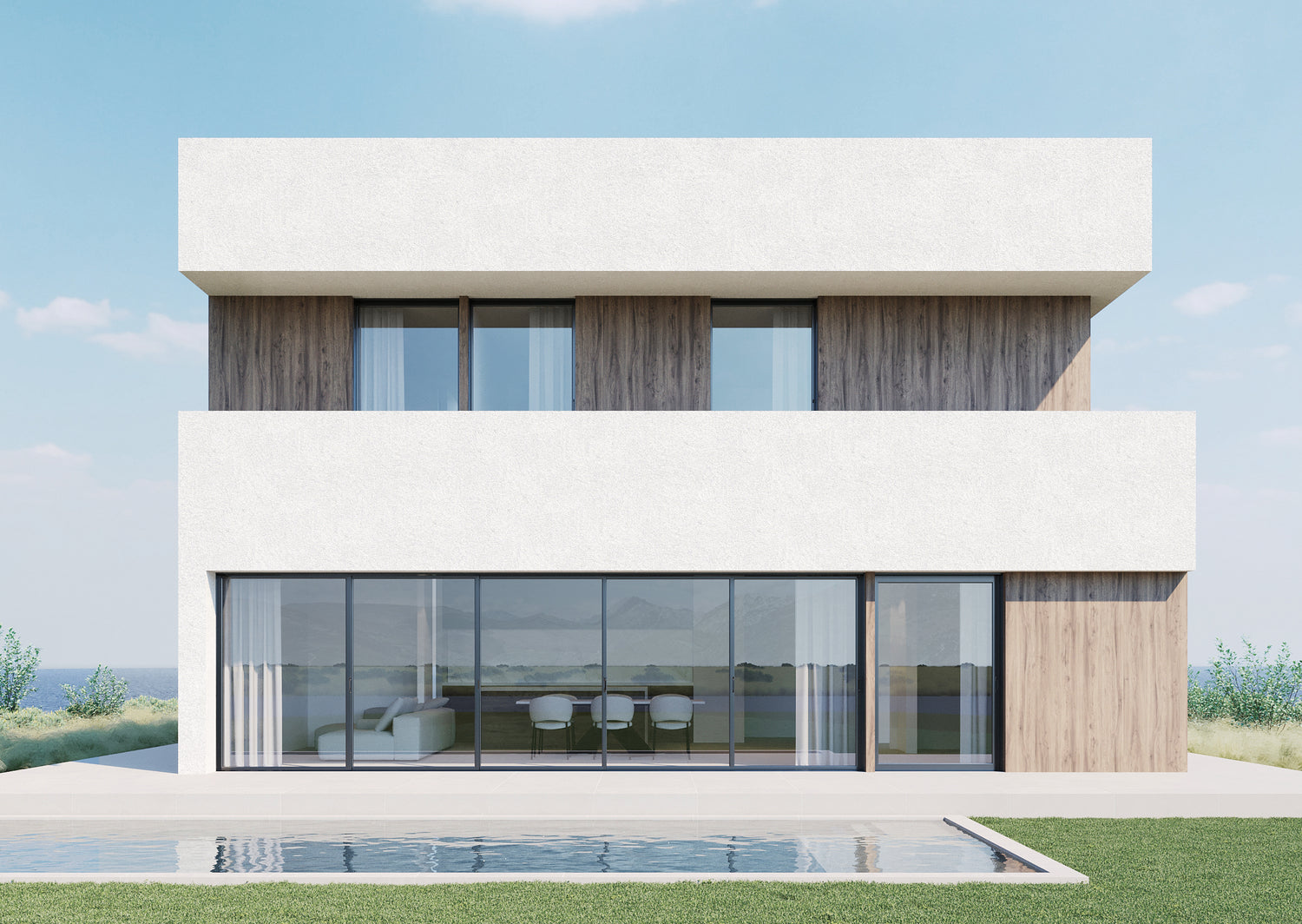 DENIA es el modelo más exuberante de nuestro catálogo. Dos grandes módulos cruzados conforman la volumetría de esta vivienda, la cuál la hace perfecta para aquellos que quieran disfrutar de las vistas.