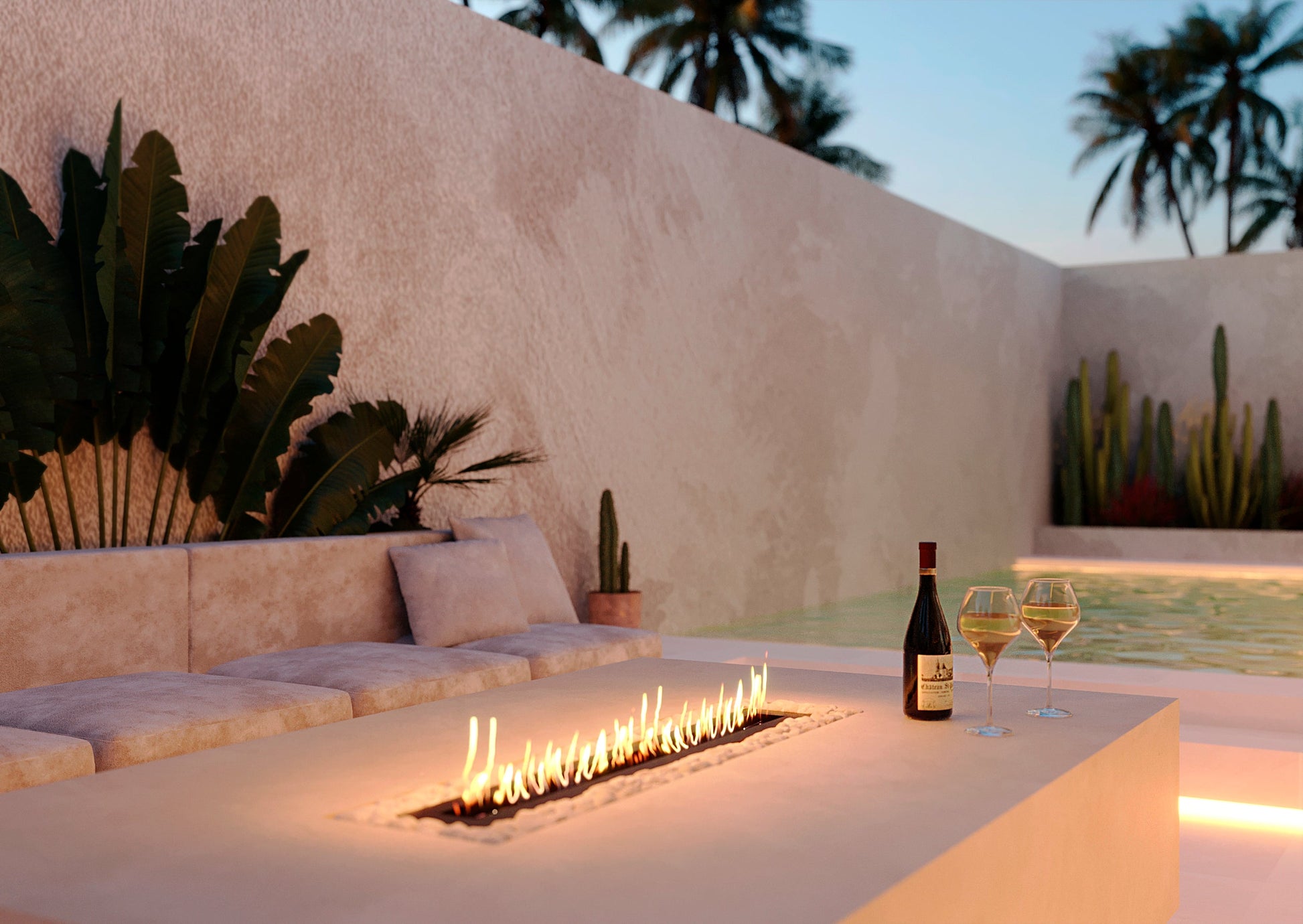 Fabricada de forma artesanal y de microcemento, esta mesa de centro resiste los elementos exteriores y conserva su belleza con el tiempo. El quemador de Bioetanol incorporado evoca la atmósfera de una llama abierta sin los subproductos asociados a una chimenea de leña, además de agregar una fuente de calor acogedora para disfrutar de noches más frescas al aire libre.